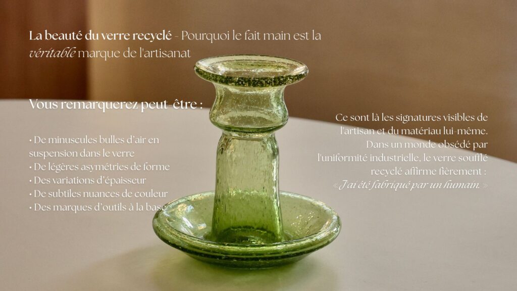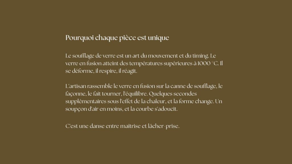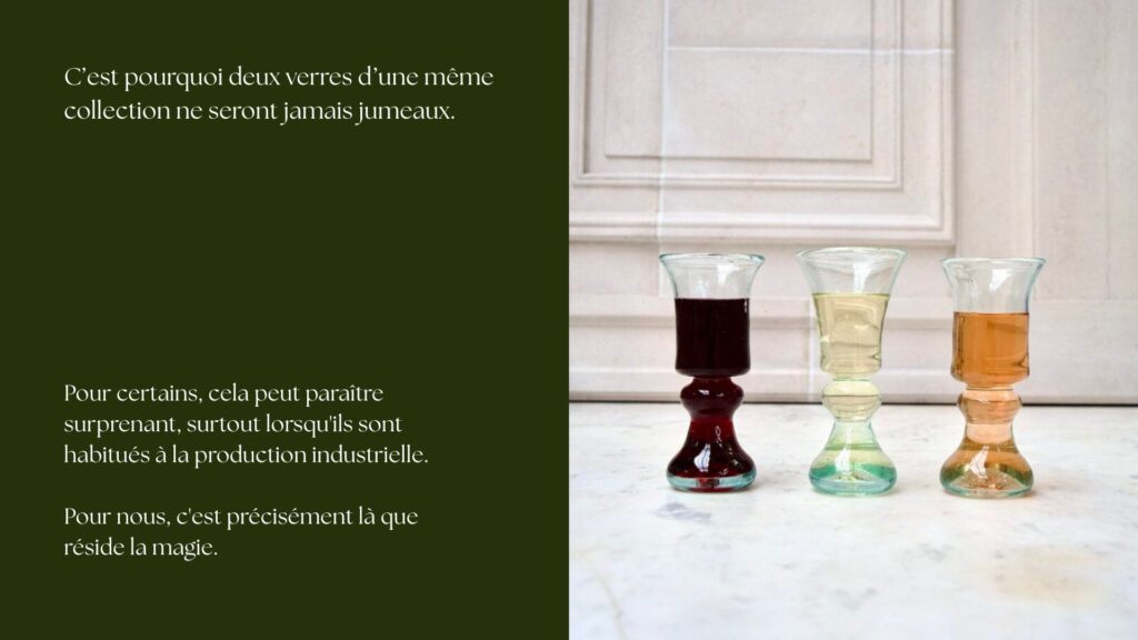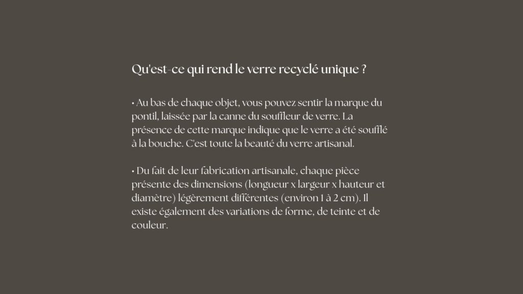 Ils sont entièrement réalisés à la main et chaque création est unique. Par conséquent, il peut y avoir une légère variation de couleur, de texture et de taille entre chaque pièce (environ 1 cm à 2 cm d’une pièce à l’autre). Sur la base de chaque objet, on peut sentir la marque de pontil laissée par la canne du souffleur de verre. La présence de cette marque indique que le verre a été soufflé à main levée. C’est la beauté du fait main.