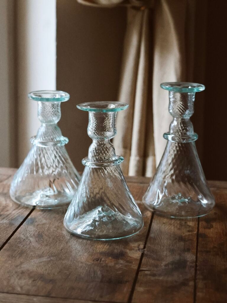 Whether used as a delicate bud vase for a single wildflower or as a sculptural base for a taper candle, the silhouette of ‘Porte Cierge Venezia Rond’ evokes the charm of antique French apothecary jars. Each piece is a testament to the savoir-faire of our studio, bringing a poetic, light-catching movement to your interior decor.